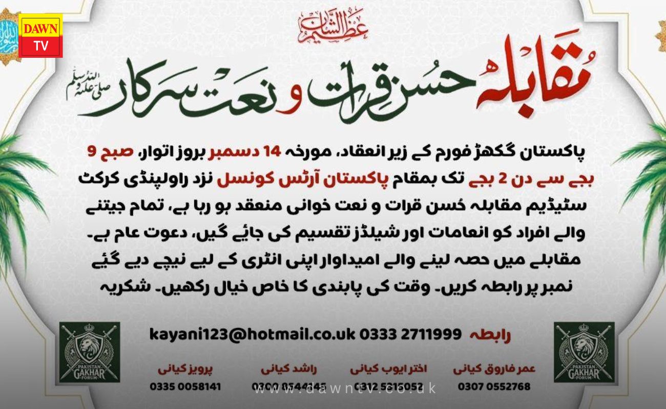 Staff Reporter, Daily Dawn, Dawn TV Report Rawalpindi: Pakistan Gakhar Forum will organize a beauty contest for Quran and Naat…